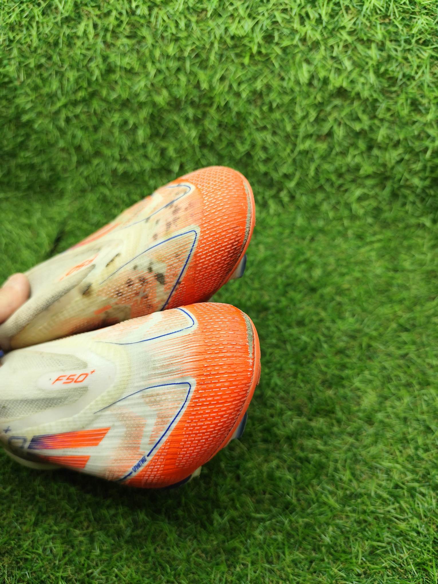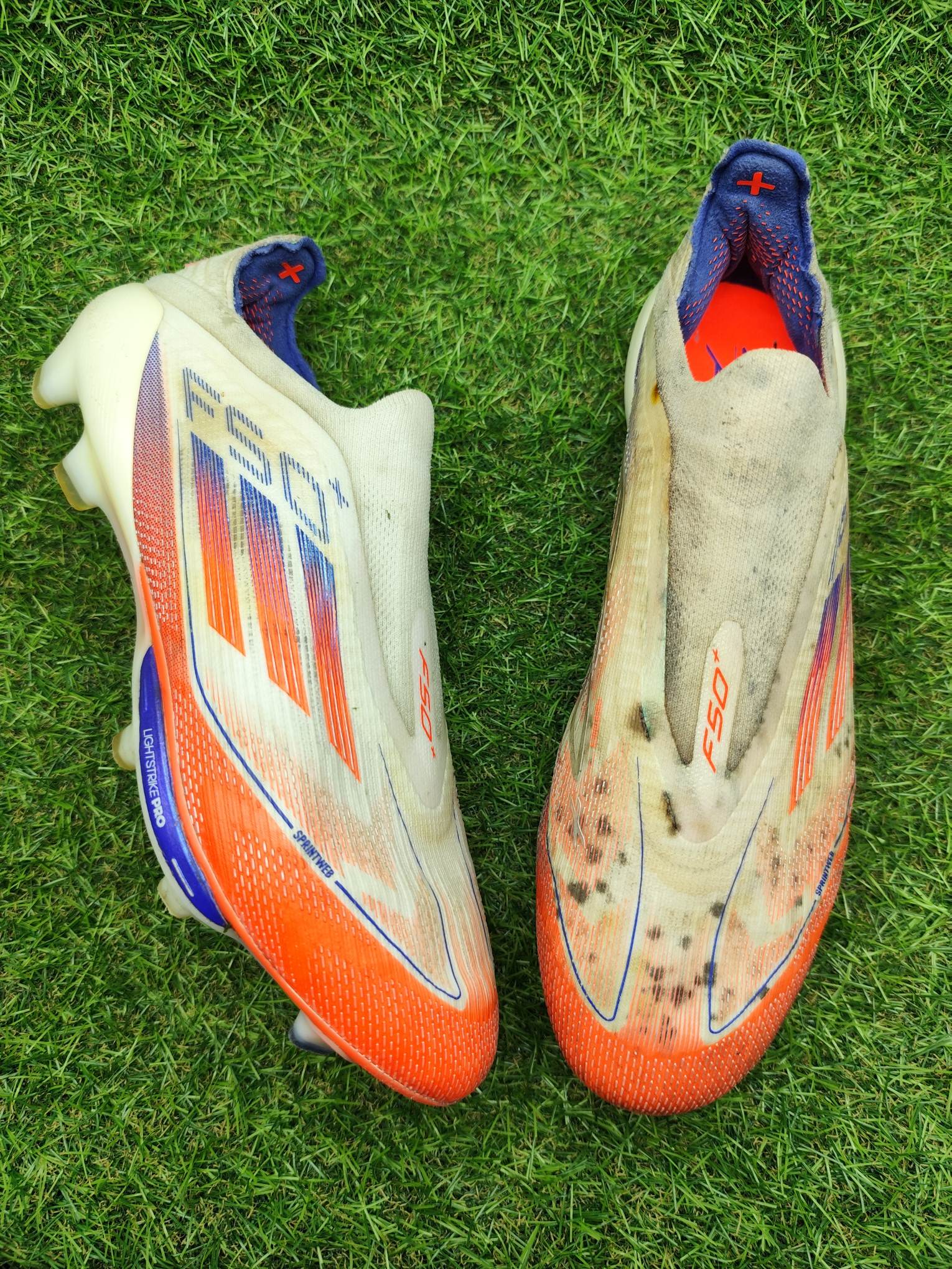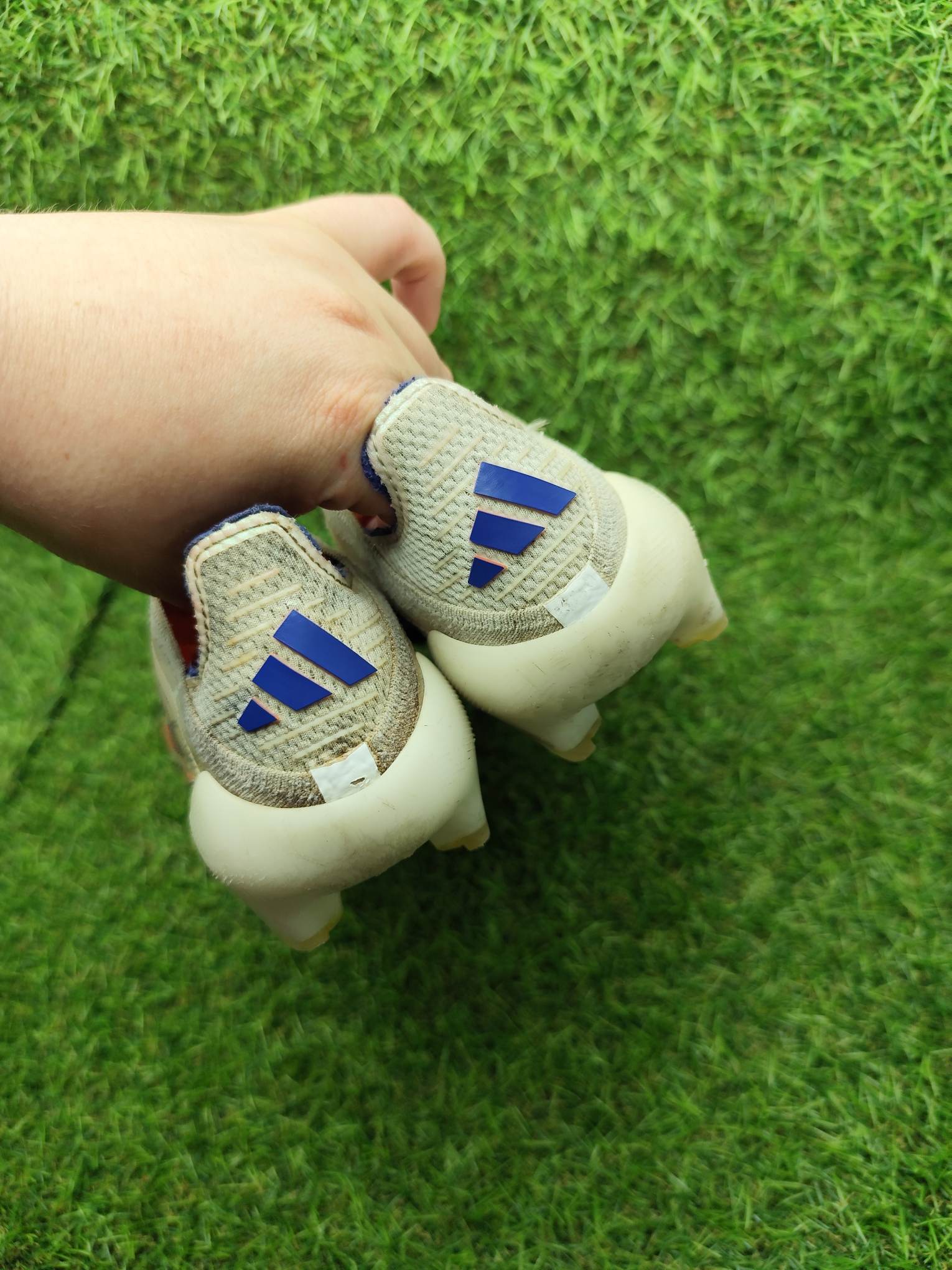 Buty używane, z widocznymi śladami gry (przetarcia, możliwy brak farby w niektórych miejscach), na jednym z butów przebarwienia które powstały w skutku gry na naturalnej trawie. Tam, gdzie było to potrzebne, zostały naprawione, aby zachować pełną funkcjonalność. Nie rozklejają się, nie mają dziur i są w pełni gotowe do gry.