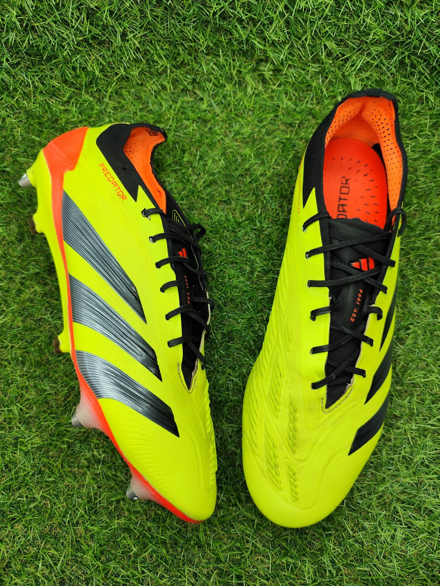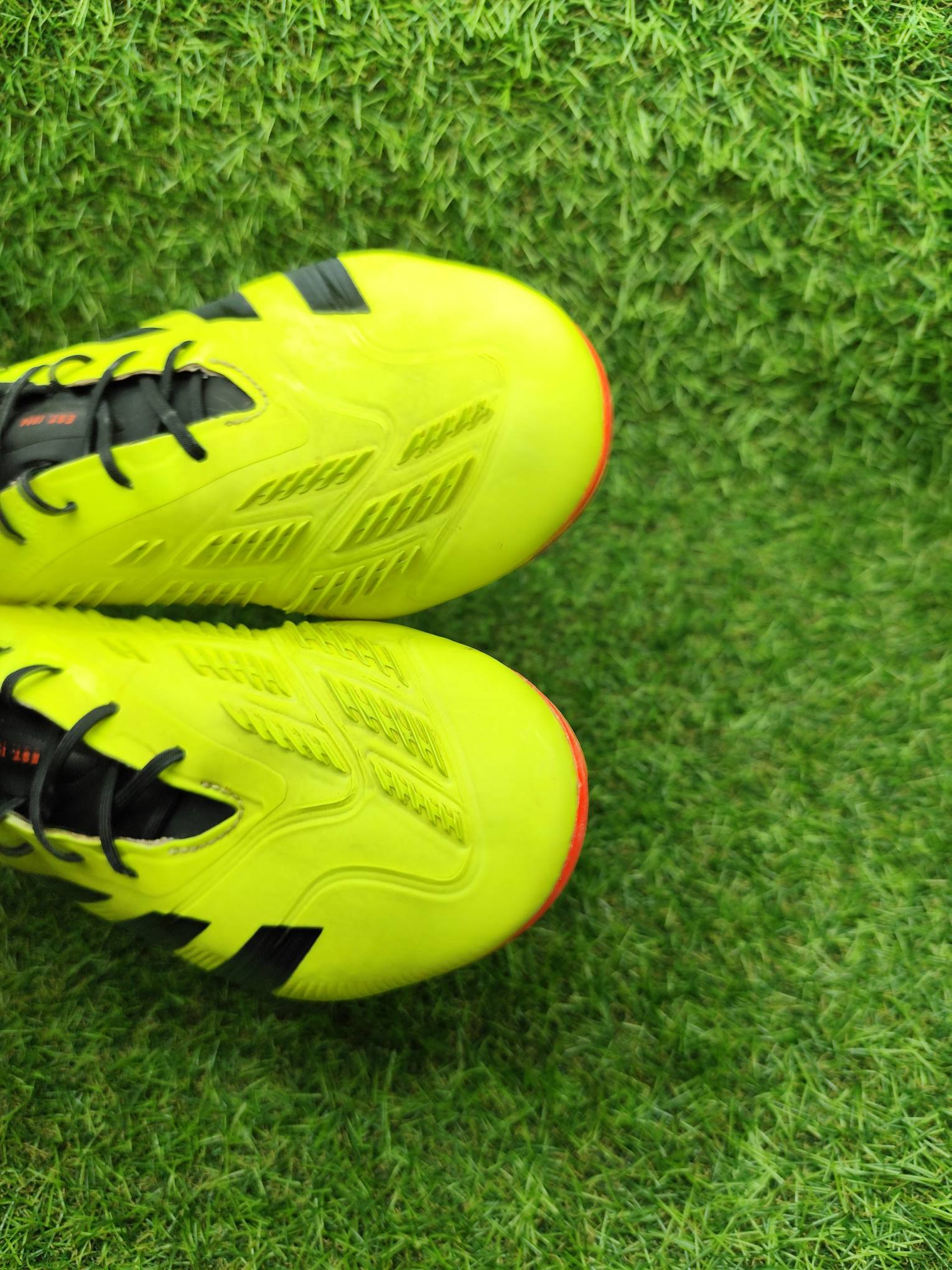 Buty używane w dobrym stanie, minimalnie naprawiane, w pełni sprawne. Mogą występować lekkie ślady użytkowania typowe dla obuwia piłkarskiego, ale nie posiadają dziur, uszkodzeń ani rozklejeń.