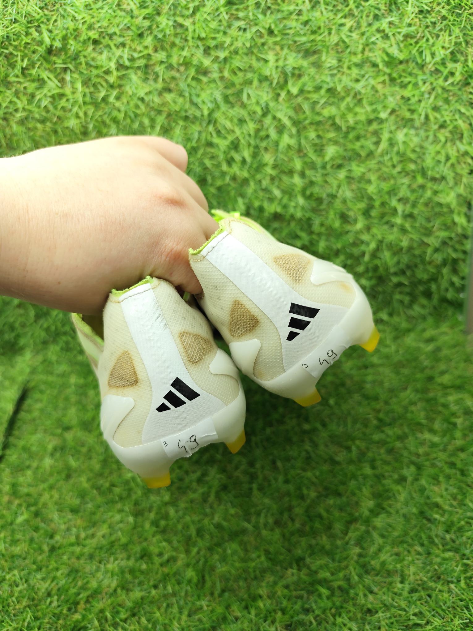 Buty używane w dobrym stanie, minimalnie naprawiane, w pełni sprawne. Mogą występować lekkie ślady użytkowania typowe dla obuwia piłkarskiego, ale nie posiadają dziur, uszkodzeń ani rozklejeń.