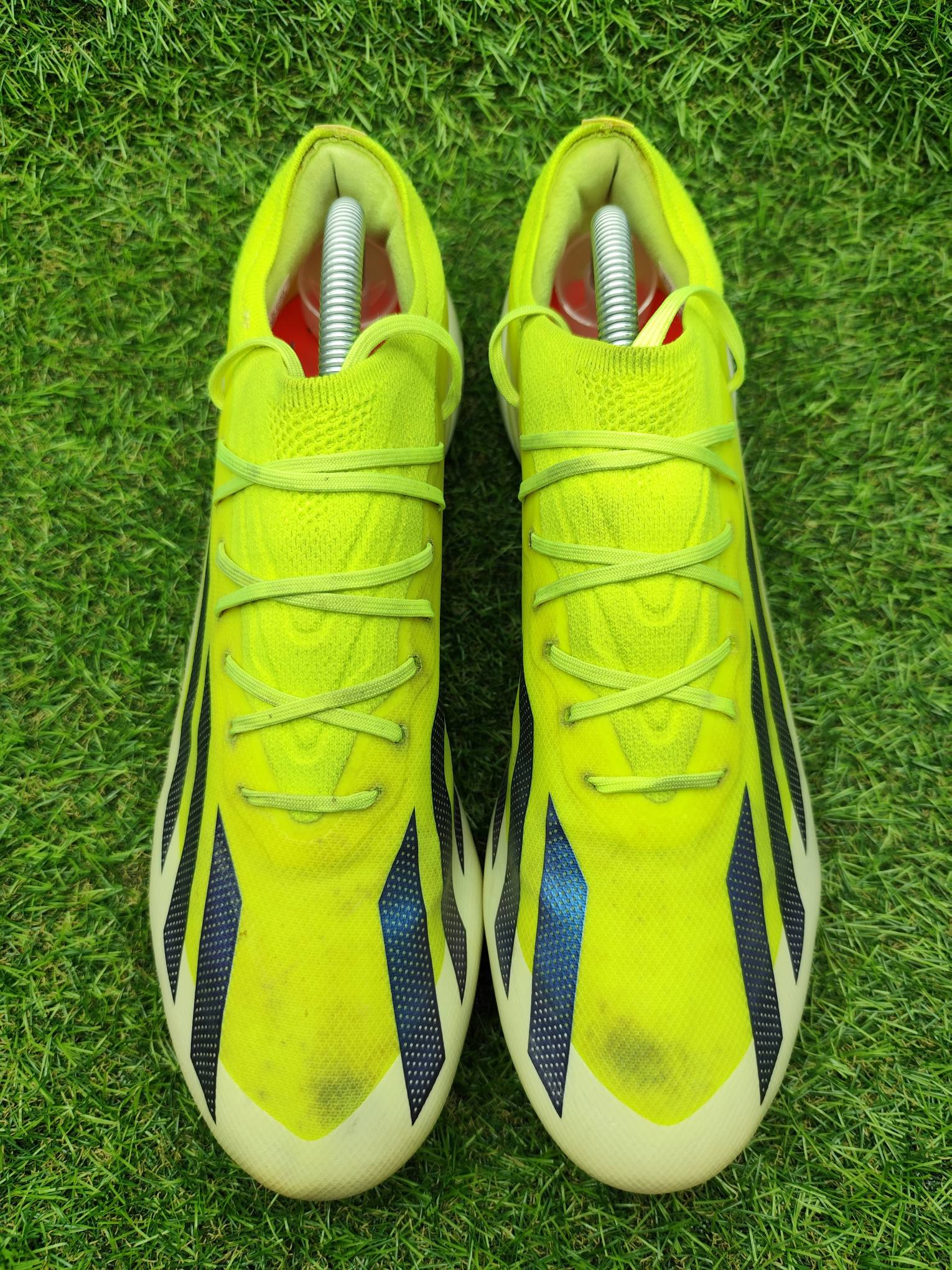 Buty używane w dobrym stanie, minimalnie naprawiane, w pełni sprawne. Mogą występować lekkie ślady użytkowania typowe dla obuwia piłkarskiego, ale nie posiadają dziur, uszkodzeń ani rozklejeń.